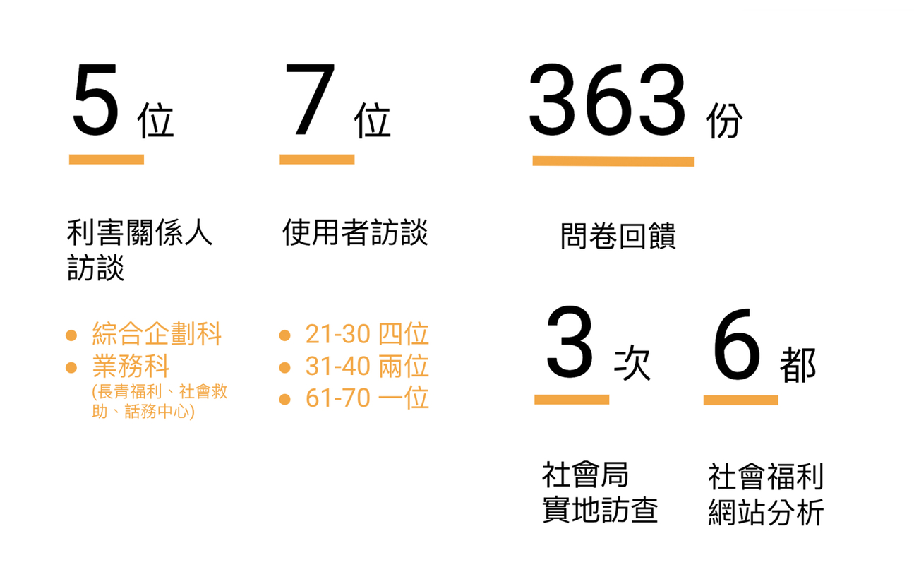 透過訪談 5 位內部利害關係⼈、7 位外部使用者、363 份問卷回饋、3 次實地訪查,同時比較了六都的社福網站規劃,團隊盤點出社會局網站的五大議題: