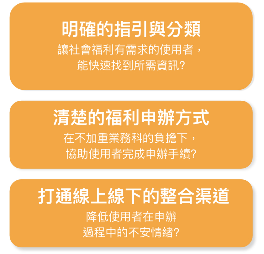 團隊經研究後發現三項關鍵議題,分別為「不明確的服務指引」、「申辦流程不清楚」,以及「線上下服務存有斷點」。團隊於是透過完善服務引導、重整公文呈現方式、連結社福地圖等作為,在不增加業務科的負擔下,優化網站的使用體驗。