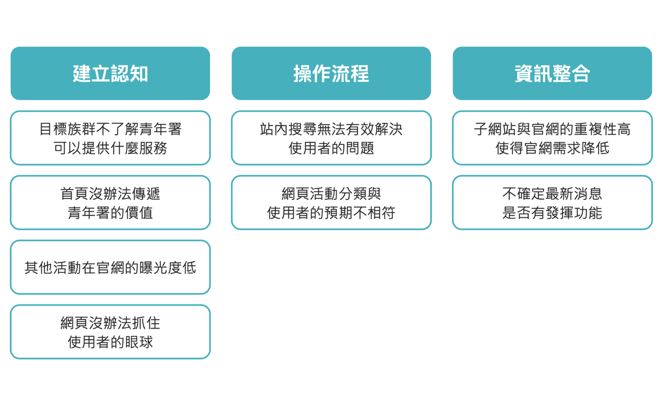 1. 建立認知:目標族群無法完成接收到網站傳遞的價值。 2. 操作流程:站內搜尋、分類功能不符合預期。 3. 資訊整合:子網站、官網重複性高。