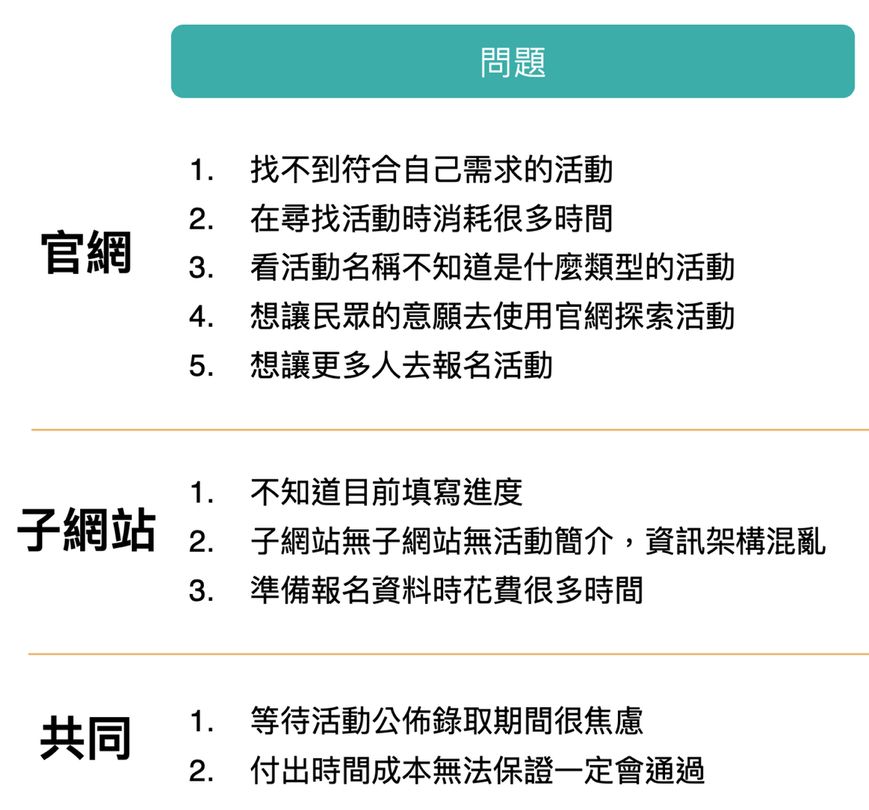 經訪談過部會人員後,得知青年署現在的問題為「活動參與不踴躍」;同時,各項計畫的內容公告不清,有時連部會人員也會面臨「找不到東西」的窘境。重塑需求後,既有問題大致可分為三個層面:「建立認知」、「操作流程」、「資訊整合」。